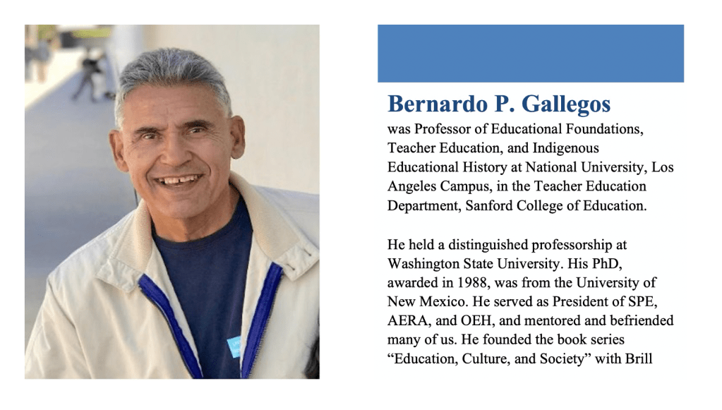 Today we gather to reimagine democracy in the Biden–Harris Administration and beyond, and to think, write, teach, and lead educationally in social movements, civil organizations, and institutions. We meet as a force for justice against the national swell of anti-Blackness, insurrection, and conspiracy theory. Advocating for a critical, socially, and racially just democracy, we pay tribute, in memoriam, to our good friend, mentor, and esteemed colleague Bernardo P. Gallegos and his legacy. A president of the SPE, he was a scholar of Indigenous narratives and identities, history, and colonial legacies. As engaged scholars, we honor his larger-than-life presence with this conference program and other work.